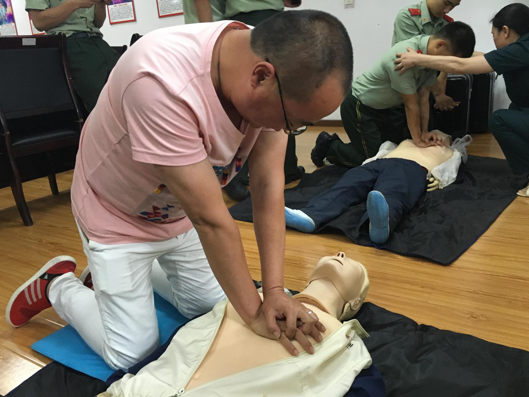 此次培训特邀荆门市红十字会工作人员就基本应急救护知识进行专业讲解。培训现场采取用假人进行模拟教学,讲师就心肺复苏、创伤急救、止血等常见病害的救护前症状判定、实际救护方法及注意事项、救护成功的反应,尤其对寻找心肺复苏的按压点、按压手势方法、按压频率以及人工呼吸的注意事项等进行了详细讲解。培训现场气氛轻松活跃,参训人员纷纷参与实际操作,对假人进行按压、人工呼吸等救援操作。