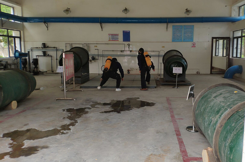 演练开始前,三水厂负责人对全厂职工进行了防火灭火知识培训,并安排专人详细讲解了消防水袋、灭火器和呼吸机的使用方法。活动中,参演人员还分批次进行了灭火和漏氯预防实战演练。