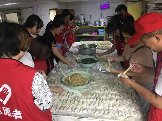 大家各司其职,有的择菜、洗菜,有的剁馅、和馅,有的包饺子、煮饺子,有的打扫卫生,有的陪老人拉家常,了解他们的饮食起居。大家边聊天边干活,院里笑声不断、其乐融融。