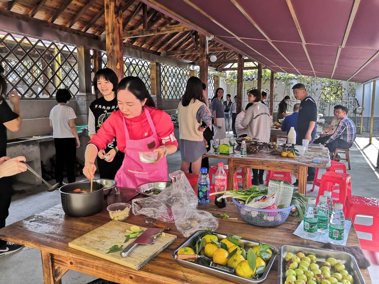 经过两个小时的紧张忙碌,一道道色香味俱全的美味佳肴陆续展示在大家面前。虽然都是家常菜,但品尝着用自己汗水换来的劳动成果,一个个喜笑颜开,大家像一家人一样,围坐在一起,互品互赞,其乐融融。