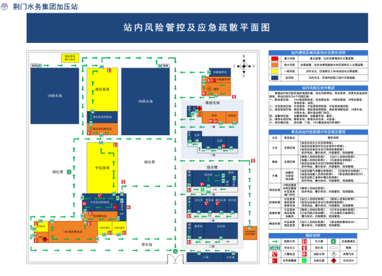 加压站在站内全面推行安全风险分级管控和隐患排查治理双重预防机制,对作业现场可能存在的安全风险进行全面识别、评估和分级,同时制作风险四色图和风险告知牌,将安全风险等级从高到低按区域依次划分为重大、较大、一般和低风险,分别用红、橙、黄、蓝四种颜色标示,明确不同区域的风险等级、防范措施和相关责任人,以最直观的方式展示作业现场的安全风险及防范措施。根据风险四色图和风险告知牌外来人员能了解所处区域可能存在的风险,做好自身防护,施工人员则可以做好施工前的风险管控,降低作业过程中的安全风险。