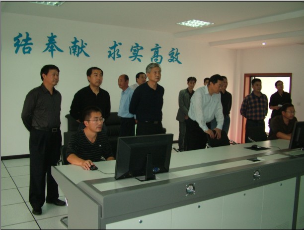 10月10日,省委第八巡视组组长詹才泳在副市长黄爱国、市住建委主任杨剑、市供水总公司总经理陈卫国陪同下视察杨树港污水处理厂。图为在调度监控中心察看污水处理工艺的情景。