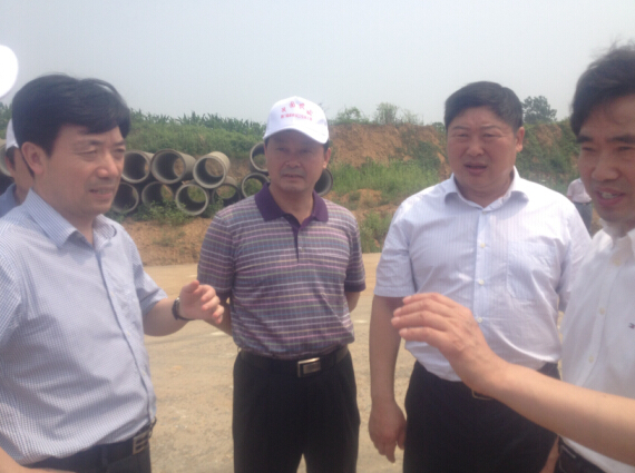 总经理陈卫国(中)和屈家岭管理区工委书记汤旺林(右二)、工委主任郑斌(左一)、市水务局局长曾云(右一)商谈施工事宜。