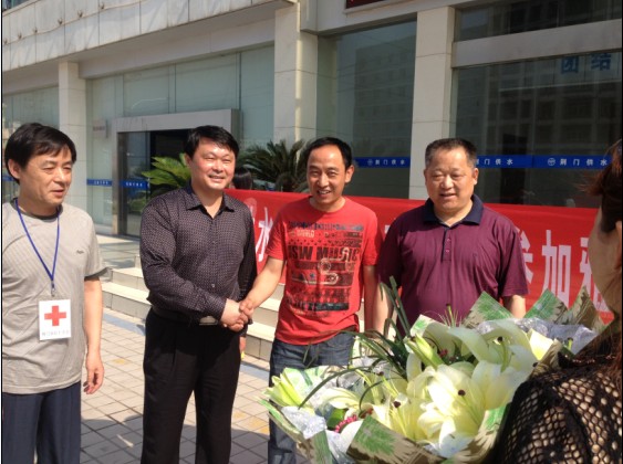 5月12日上午,市住建委领导以及供水总公司干部职工在供水大楼前热烈欢迎供水职工彭华从四川雅安救灾一线平安胜利归来。