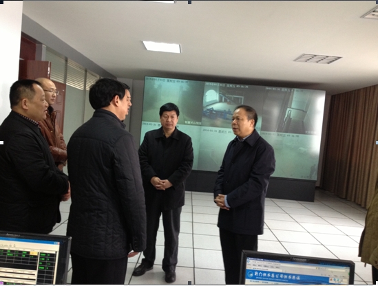 1月31日(正月初一)市委书记万勇(右二),市委常委、秘书长周友坤(右三)慰问春节期间仍然坚守在工作岗位的供水员工,图为在调度监控中心时的情景。