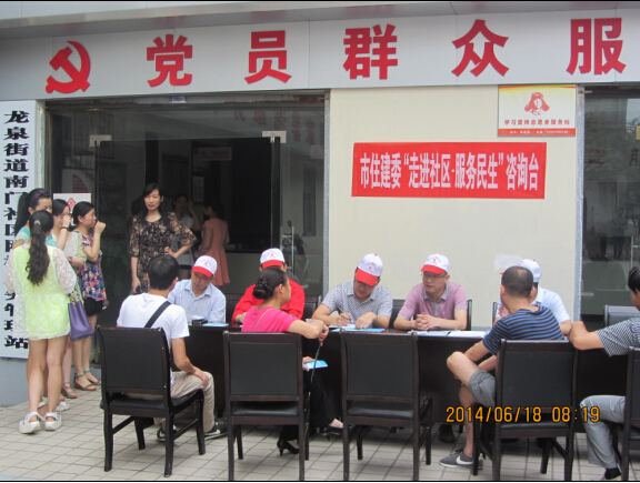 市供水总公司党委书记陈永根(左二)在“走进社区、服务民生,走进企业、服务发展”活动中,深入龙泉街办南门社区倾听用户呼声,办实事,解难题。