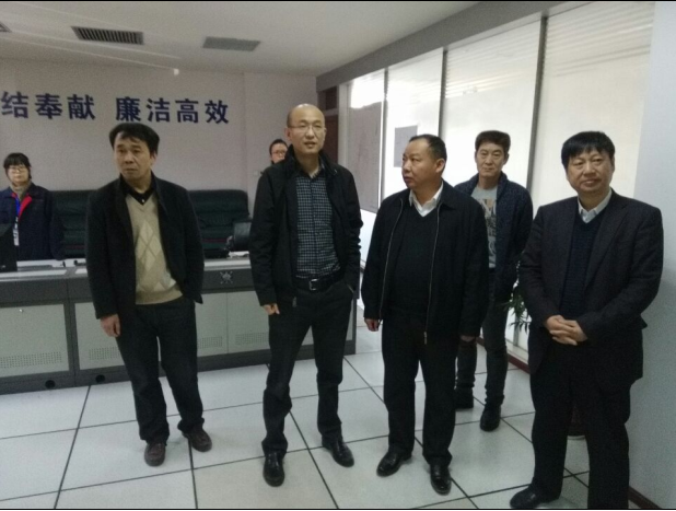 4月14日,省文明办主任胡和平(前排右二)在市委常委、市委秘书长周友坤(右一)、市委宣传部副部长、文明办主任樊雁陪同下到公司指导创建全国文明单位工作,市供水总公司党委书记、总经理陈永根介绍相关情况。图为在调度监控中心视察时的情景。