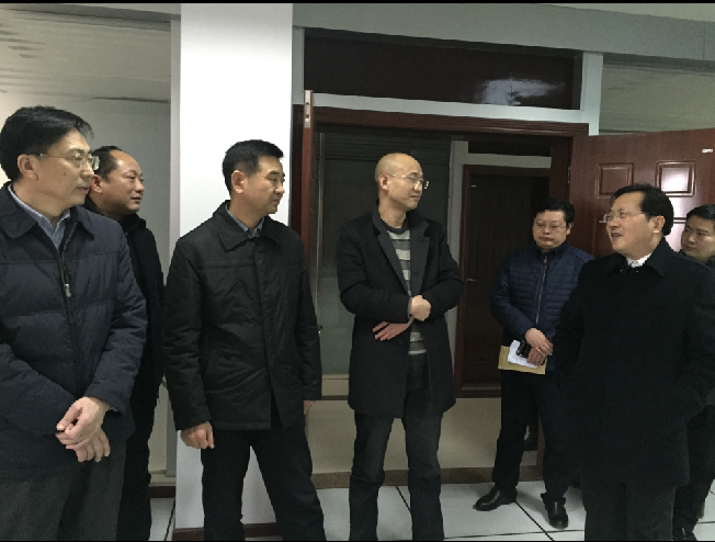 1月29日下午,副市长王良新(左一)、政协副主席舒行飚(右二)等领导在市住建委党委书记、主任杨剑(左三)、公司党委书记、总经理陈永根(左四)陪同下亲切看望慰问春节期间仍然坚守岗位的供水员工。图为在调度监控中心时的情景。