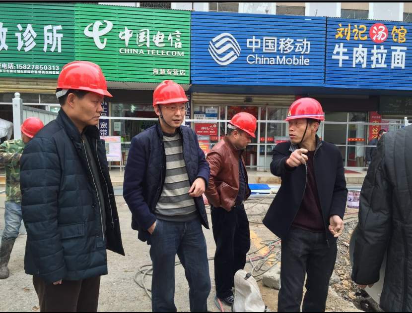 荆门市供水总公司党委书记、总经理陈永根(左二)等在象山大道海慧地下通道供水管道施工现场。