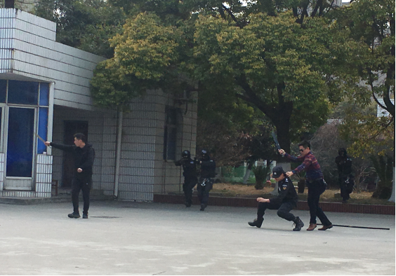 本次演练以在全国“两会”召开前夕,2名暴恐份子密谋在市供水总公司三水厂采取投毒方式实施暴恐袭击为背景展开。市公安局指挥中心接到水厂员工报案,2名暴恐份子驾车携带剧毒氰化物和匕首来到三水厂,密谋投毒、伤人。市公安局指挥中心立即派辖区派出所和巡逻组前往处置。在投毒失败后,嫌疑人刺伤安保人员并挟持人质,与民警对峙。随后,市公安局迅速启动反恐防范一级响应,调派辖区分局、巡特警、刑侦、交警等部门赶赴现场开展工作。短短3分钟,暴徒迅速被控制,其中有一名暴徒被当场击毙,人质被成功解救。之后,120急救中心赶往现场救治,同时环境监测部门迅速开展水质检测评估,确保水厂供水安全。至此,反恐防暴演练活动顺利结束。