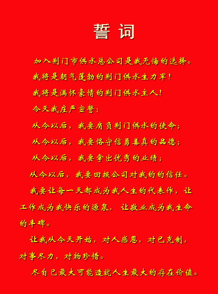 “加入荆门市供水总公司是我无悔的选择。我将是朝气蓬勃的荆门供水生力军! 我将是满怀豪情的荆门供水主人!今天我庄严宣誓:从今以后,我要肩负荆门供水的使命;从今以后,我要恪守信勇善真的品德;从今以后,我要拿出优秀的业绩......”入职宣誓仪式现场,新进员工举起右拳,庄严宣誓,铿锵有力、掷地有声的誓言响彻在会议室,久久回荡在每一位员工的心田,震憾着他们的思想。