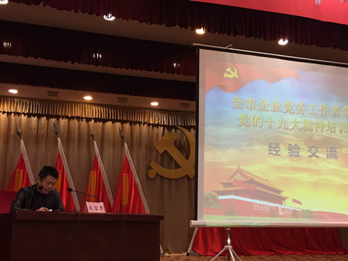 12月11日至12日,由市委组织部、市国资委联合举办的全市企业党务工作者学习党的十九大精神培训会在荆门宾馆召开。会上,四家企业进行党建经验交流,市供水总公司党委副书记、纪委书记徐黎明就加强企业基层党建工作作交流发言。