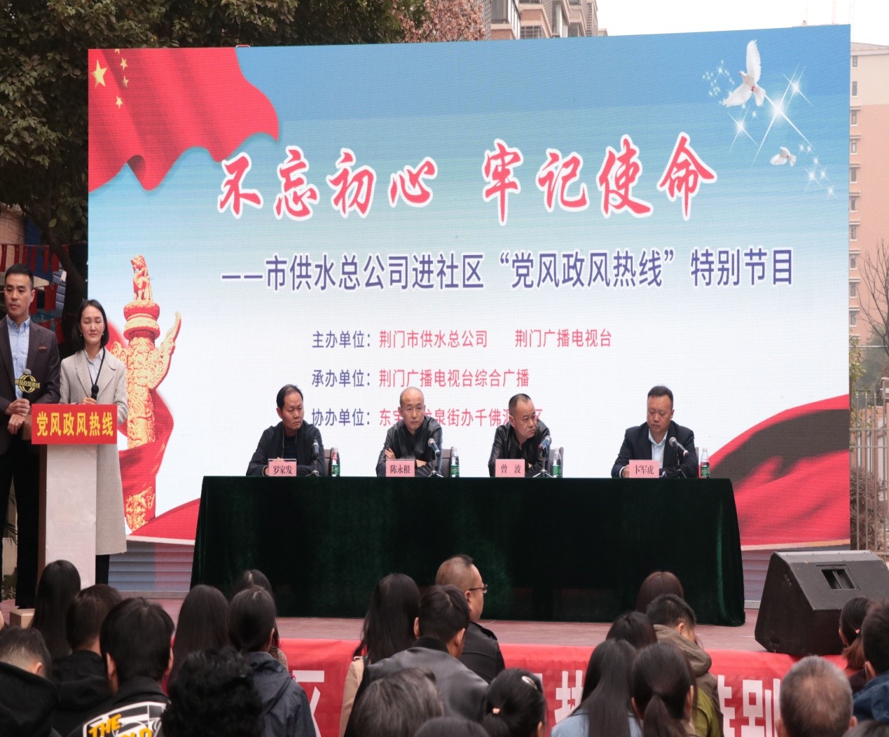 11月 6日上午,由荆门市供水总公司和荆门广播电视台联合举办的“荆门供水进社区‘党风政风热线’特别节目”在荆门千佛洞社区举行。市供水总公司党委书记、总经理陈永根带领领导班子相关成员参加节目现场(网络)直播,围绕“不忘初心、牢记使命”主题教育,倾听民情民意,接受现场问政,回应百姓诉求,解决用户难题。