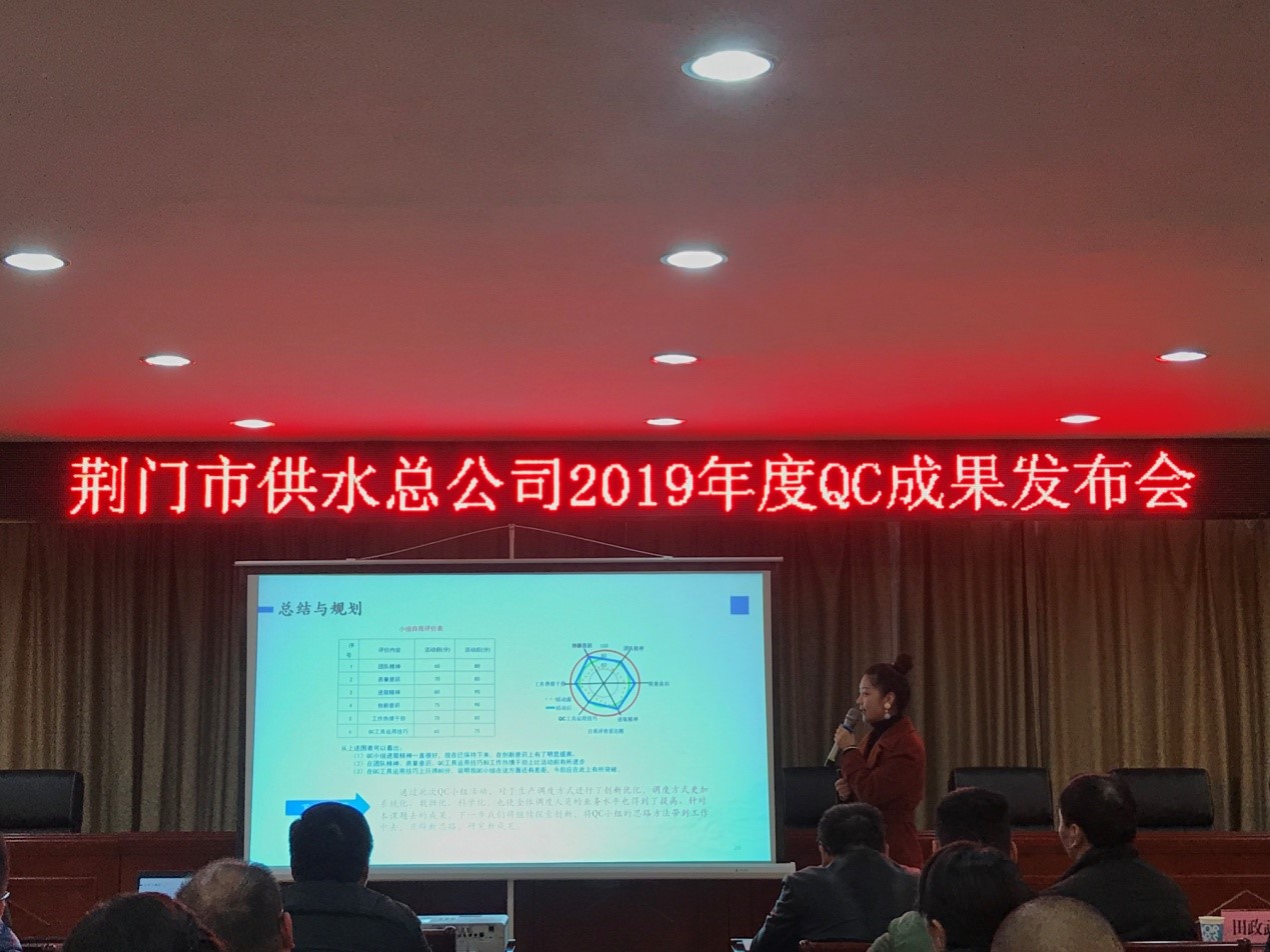 12月6日,荆门市供水总公司首届QC成果发布会在总公司六楼会议室顺利召开,质量专家、国家级评审员刘佐光老师、荆门市质量协会田政武秘书长、公司副总经理徐安祥及各部门主要负责人参加了发布会,会议由QC工作组组长刘昕平主持。