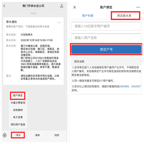 1.进入“荆门市供水总公司”微信公众号,点击“用水”,选择“账号绑定”,点击“绑定新水表”,输入10位数字用户编号、用户名称绑定户号。