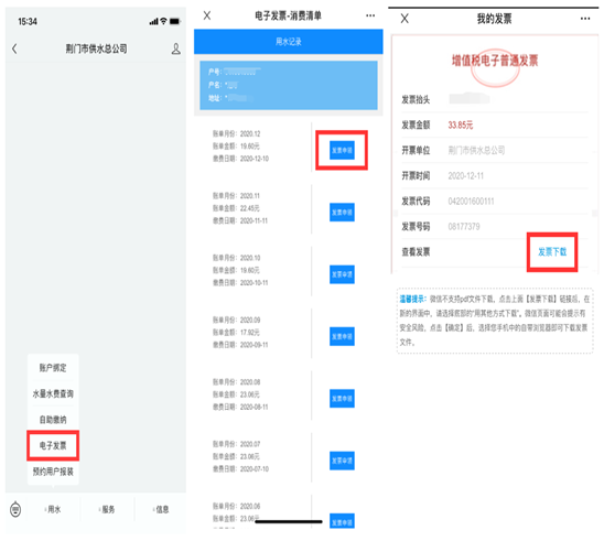 用户在缴费成功后,只需关注“荆门市供水总公司”微信公众号或登录网上营业厅,进入电子发票模块,即可查询、申领、下载打印水费电子发票。目前,电子发票系统运行平稳顺利。