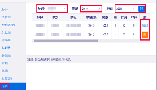 3.点击“开票信息”选择“用户编号”,选择月份,点击“查询”,点击“开票”,点击“发票下载”。