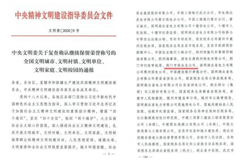 据悉,“全国文明单位”称号是中央文明委授予创建单位的最高荣誉。市供水总公司继续保留荣誉称号,是企业文明单位创建活动扎实推进、创新发展的一大丰硕成果。公司连续十一届被省委、省政府授予省级文明单位,连续十二届被市委、市政府授予市最佳文明单位,2017年被中央文明办授予“全国文明单位”。2018年,在市消费者委员会发起的公服企业满意度调查中,公司总成绩排名第一,被授予“消费者满意单位”和“消费者满意品牌”。2019年,由于成功推行卓越绩效管理和用户满意管理,被市政府评选为第七届荆门市“市长质量奖”获奖企业;因全面推进依法治企,被评为湖北省省级“法治建设示范企业”;被荆楚网表彰为“全省优秀政务微信公众号”;作为全国唯一一家供水企业,荣获2019年全国市场质量信用AA等级“用户满意企业”称号。2020年,公司先后被评为荆门市建设江汉平原振兴发展示范区先进集体,在全市要素保障类满意度测评中继续名列榜首。三水厂团支部被共青团中央表彰为“全国五四红旗团支部”。咏泉水质检测有限公司曹俊同志荣获“全市优秀共产党员”和“荆门市抗击新冠肺炎疫情先进个人”荣誉,供水维修班长黄磊获评“荆门好人·最美逆行者”荣誉称号,加压站员工闫寒家庭荣获2020年“最美家庭”荣誉称号。