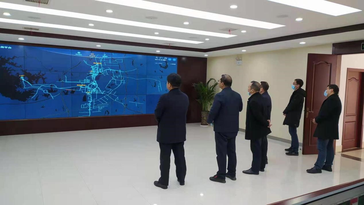 在荆门供水调度监控中心,梅勇常委详细了解应急指挥系统运行和供水服务情况,并对公司保障城市安全供水和优质服务工作给予高度肯定。