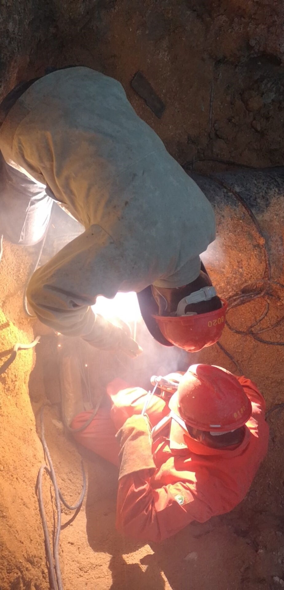 图为施工人员连夜焊接安装过路管