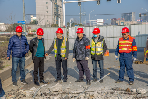 2月14日(农历正月初三)一大早,2台挖掘机、2台货车、1台工程车、1台送水车、1台小型铲车陆续开到了现场,2台发电机组和相关材料也运到了现场。7时许,近30名工作人员集结完毕。罗红胜负责现场施工。他将工作人员分成交通组和施工组。交通组先摆放锥形安全桶引导交通,再用围挡将施工区域隔离出来。随后,交通组工作人员守在几个路口引导交通。施工组也很快行动,路面切割、破碎,钢筋剪切,碎渣拖运……所有工作有序开展。