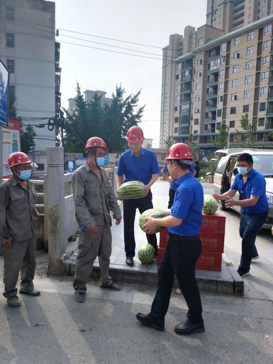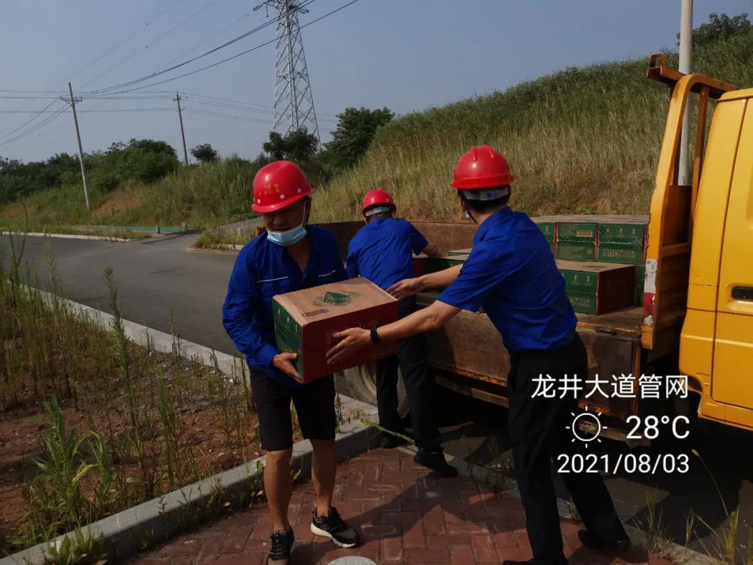 为保证工程顺利完成,一线供水工人们在酷暑中坚持正常生产,为了防止烫伤,长袖长裤是他们每个人的“标配”。此次活动,给汗流浃背的工人们送来了一块甜甜的西瓜、一瓶爱心水、一声“辛苦了”,正是因为你们的汗水,保障了供水管网的平稳,才换来千家万户清凉的自来水!